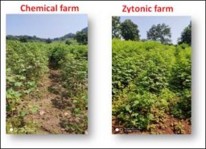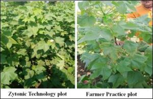 Cotton is highly sensitive to high temperatures, moisture stress and erratic rainfall. Zytonic-treated soils retain moisture longer and improve water infiltration, reducing irrigation needs by up to 30–40%. The role of Zytonic Suraksha (unique technology for harvesting water from environment and providing moisture to crop in dry weather) is quite significant in sustaining the crop even in adverse weather conditions.