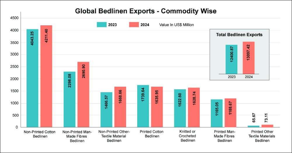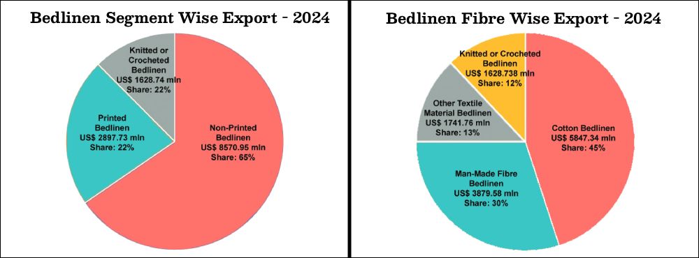 The non-printed bedlinen segment has maintained its dominance in the global market for several years. In 2024, this segment recorded exports worth US$ 4211.40 million reflecting a 4.16% increase over the previous year and now comprises 65% of total bedlinen exports.