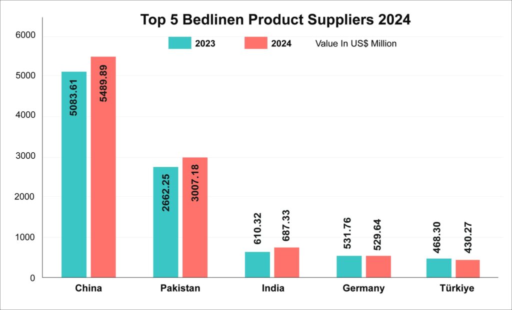Pakistan maintained its position as the second-largest global exporter with US$ 3007.18 million in exports, growing 12.96% in 2024. It now commands 23% of the global market, with non-printed cotton bedlinen making up 45% of its total bedlinen exports.