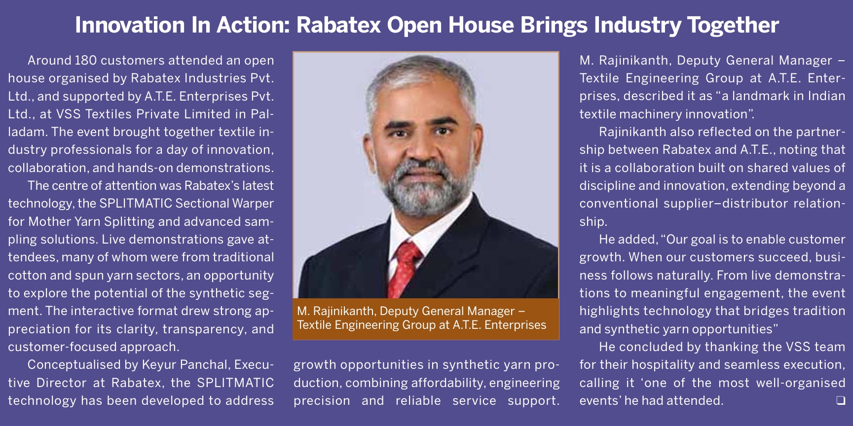 Rabatex Industries, in collaboration with A.T.E. Enterprises and VSS Textile, hosted a highly successful open house event on July 31st at VSS Textile’s premises in Palladam, Tamil Nadu. The event attracted close to 180 textile professionals, industry leaders and innovators from across the region, setting the stage for a new era in synthetic fabric production in South India.