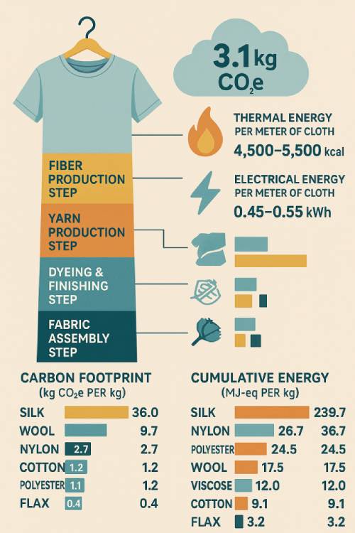 Different fibres also vary significantly in their environmental impact. Natural fibres such as silk and wool can have relatively high carbon footprints due to energy-intensive production processes, while synthetic fibres such as polyester and nylon require significant energy during polymerization and extrusion. Cotton, although widely used and comparatively moderate in terms of carbon emissions per kilogramme, has other environmental implications, particularly in water consumption and pesticide use. These variations highlight the importance of material selection, not only from a cost or performance perspective but also from a sustainability standpoint.