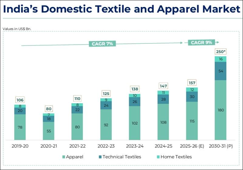 India’s domestic T&A market has grown from US$ 106 billion in 2019–20 to US$ 157 billion in 2025–26, reflecting a CAGR of 7 percent. To achieve the government’s ambitious US$ 250 billion domestic market target by 2030–31, the industry will need to accelerate growth to nearly 9 percent annually, supported by investments, productivity improvements and formalisation.