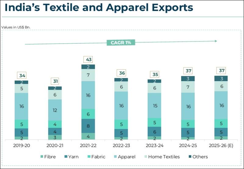 India’s textile and apparel exports stood at US$ 37 billion in 2025–26, showing flat growth compared to the previous year. Apparel continues to account for the largest share at around 45 percent, followed by textiles including yarn, fabric and home textiles.