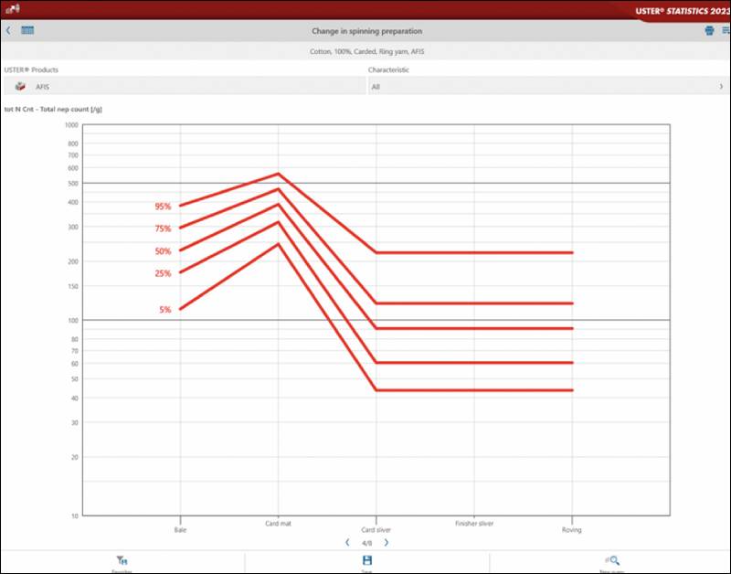Processing charts in Uster Statistics enable mills to track fiber characteristics such as neps, short fibers, and impurities across each stage of production. Typically, neps increase in the blowroom from bale to card mat, followed by a reduction after carding.